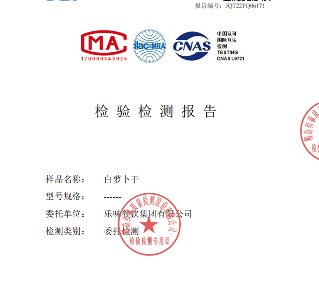 定期将食材、餐用具等器具送检,保证所有检测数据准确可信,保障客户、员工用得放心、吃得安心
